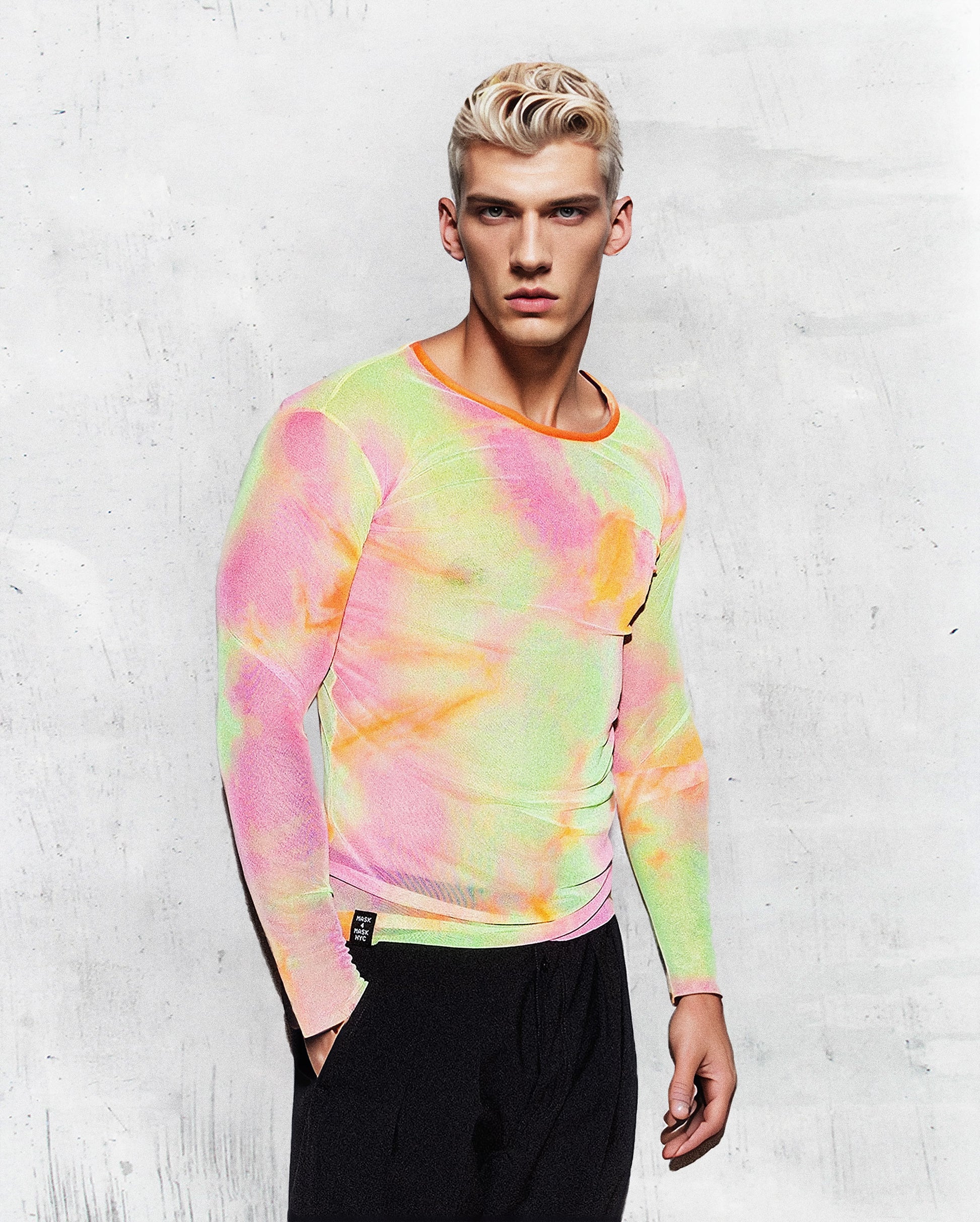 Turn heads with this vibrant long-sleeve tie-dye shirt from Mask4Mask, a NYC-based menswear brand. Featuring a bold mix of pink, green, and orange hues, accented by an orange-trimmed neckline, this form-fitting shirt is perfect for those who dare to stand out. Crafted for style and comfort, it pairs effortlessly with black pants for an edgy urban look. Complete with a subtle branded tag, it’s a statement piece for every confident man.