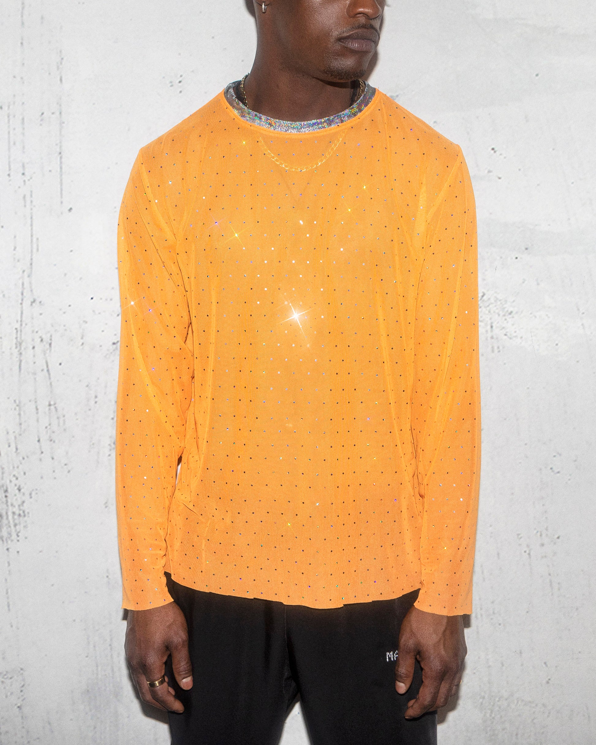 Shine bright and make a statement in this men's sheer orange rhinestone long sleeve. Designed for those who love bold fashion, this lightweight mesh top is adorned with shimmering rhinestones, catching the light with every move.