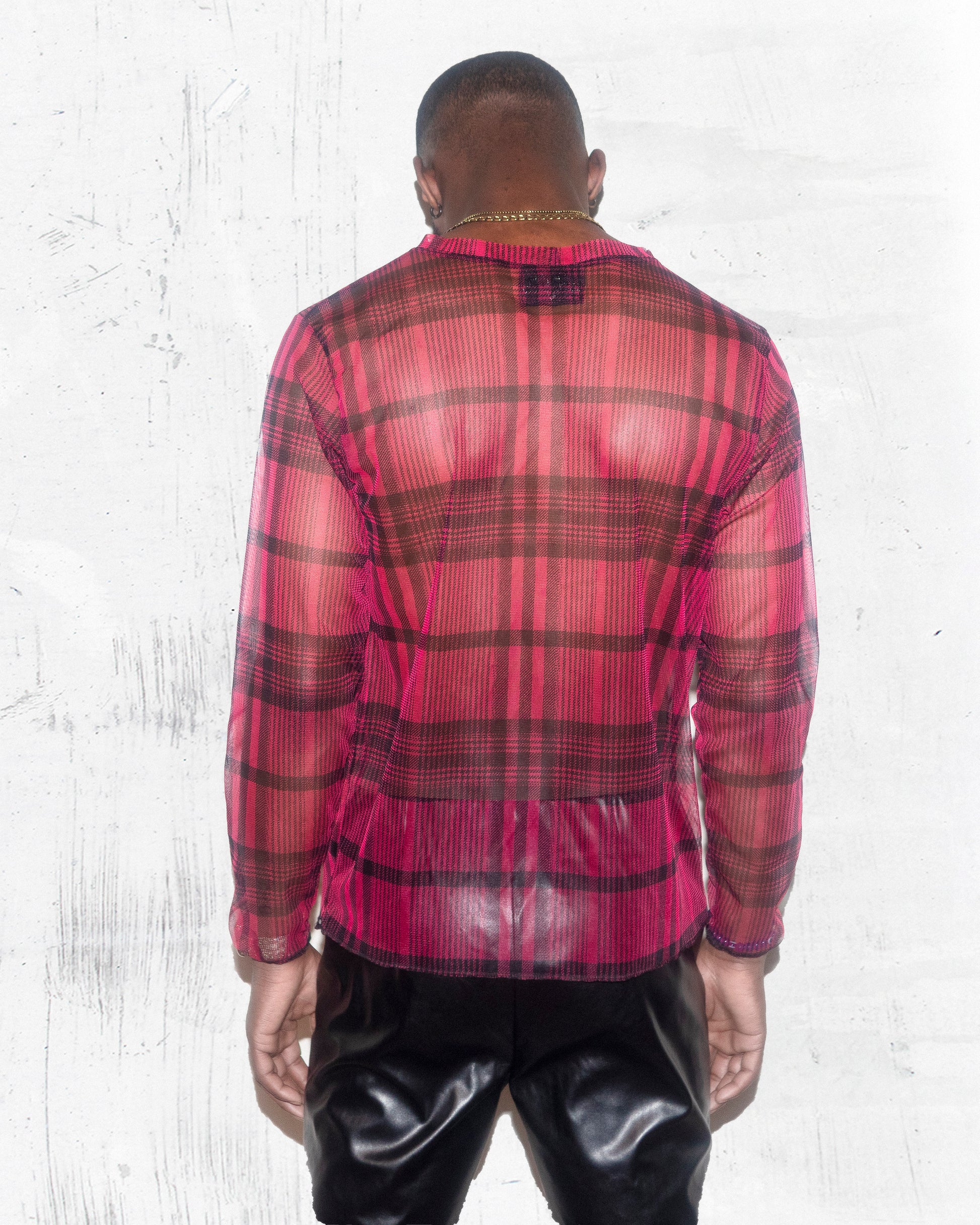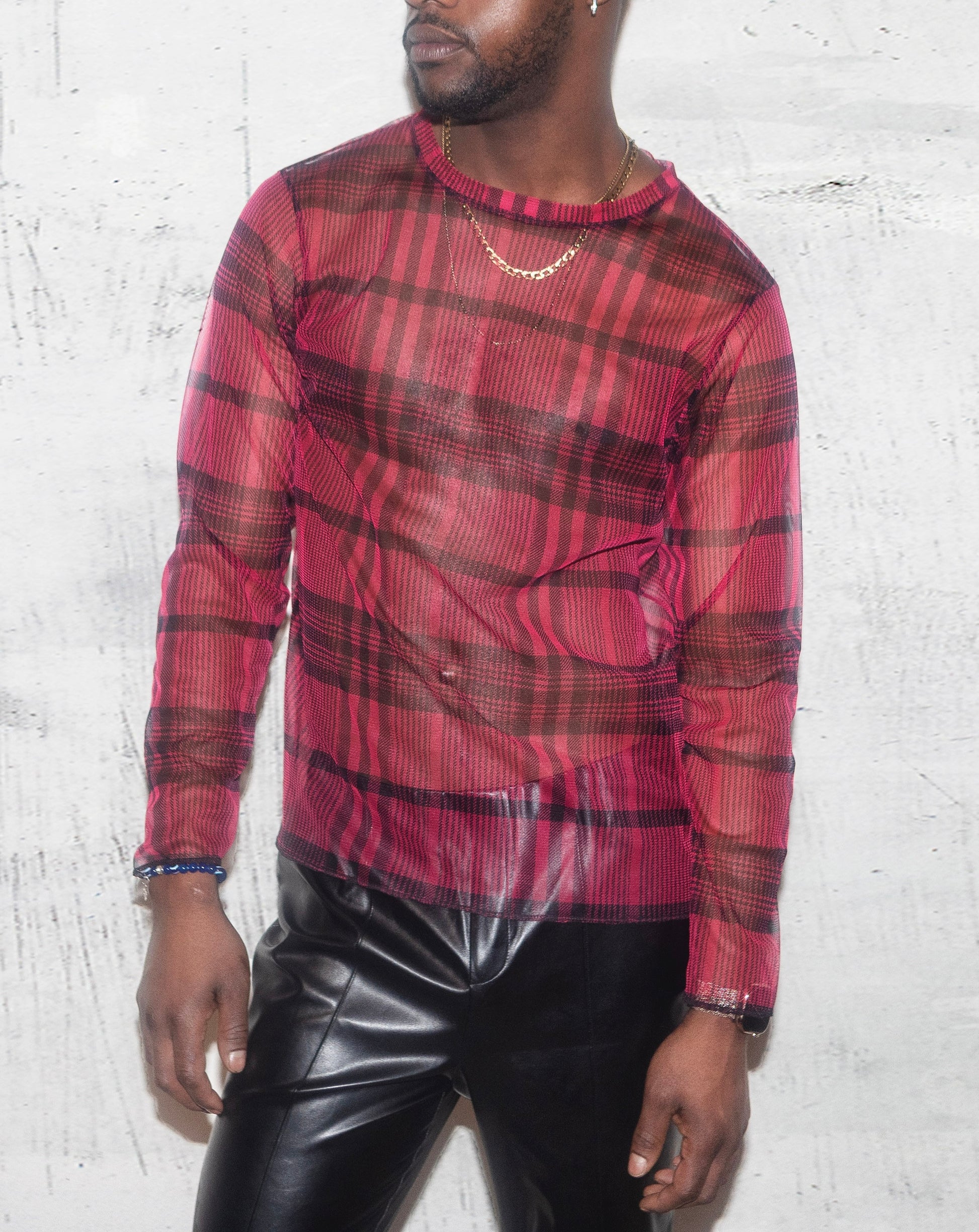 Step into the spotlight with our handmade sheer red plaid mesh shirt, crafted in the heart of NYC for bold, fashion-forward individuals. This unique design combines lightweight, breathable fabric with edgy plaid patterns, making it a standout choice for festivals, nightlife, and parties.